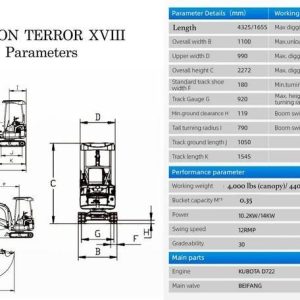 2025 4000 lb Typhon Terror XVIII Mini Excavator Rubber Track with Kubota D902 Diesel Engine Key Features