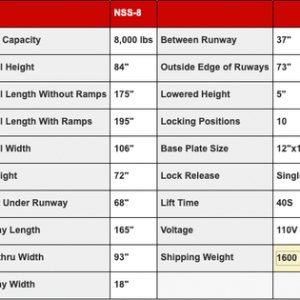 Operating on a standard **110 volts**, the NSS-8 X1 is designed for ease of installation and compatibility with most garage or shop electrical systems. Its shipping weight of **1,600 lbs (725.7 kg)** underscores the lift’s robust construction and stability, promising years of reliable service. Additionally, the inclusion of a **12″ x 12″ (30.5 cm x 30.5 cm) base plate size** further ensures a secure and stable foundation for lifting operations.
